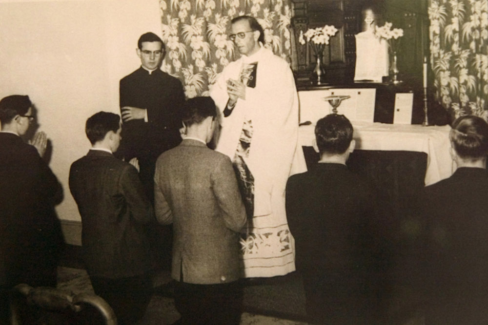 Fr. Marcial Maciel Degollado, founder of the Legionaries of Christ, leads students in taking an oath at a Legion of Christ school in Ireland in this circa 1962 photo. (CNS)