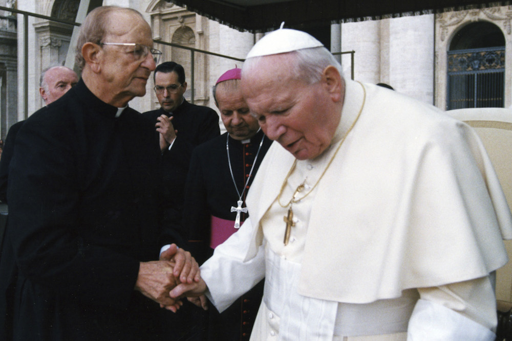 Fr. Marcial Maciel Degollado, founder of the Legionaries of Christ, greets Pope John Paul II in St. Peter's Square in this 2000 file photo. (CNS/Catholic Press Photo)