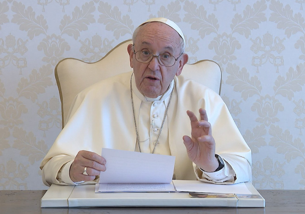 Pope Francis delivers a June 9, 2021, video message to participants of an online forum titled "Where are we with Amoris Laetitia?" dedicated to implementing proposals inspired by his 2016 exhortation of the same name. (CNS screenshot/Vatican Media)