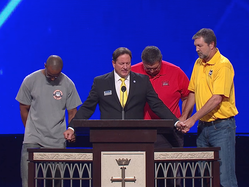 Rick McDaniel, center, superintendent of McKinney, Texas, public schools, prays at a mandatory employee meeting at Prestonwood Baptist Church in nearby Plano, Texas, in August 2017. (Screenshot via McKinney schools video)
