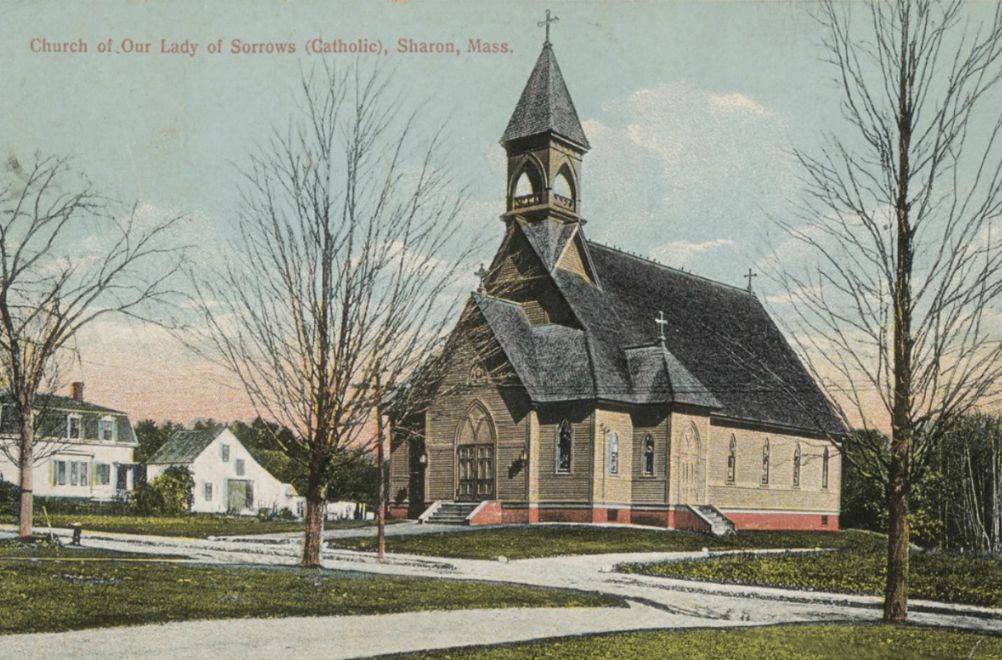 Detail of historical postcard image of the Church of Our Lady of Sorrows in Sharon, Massachusetts (RNS/ Courtesy of American Ancestors, New England Historic Genealogical Society)