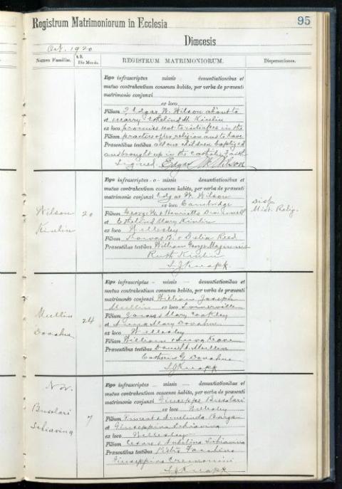 An October 1920 marriage registry recorded in Latin (RNS/ Courtesy of American Ancestors, New England Historic Genealogical Society)
