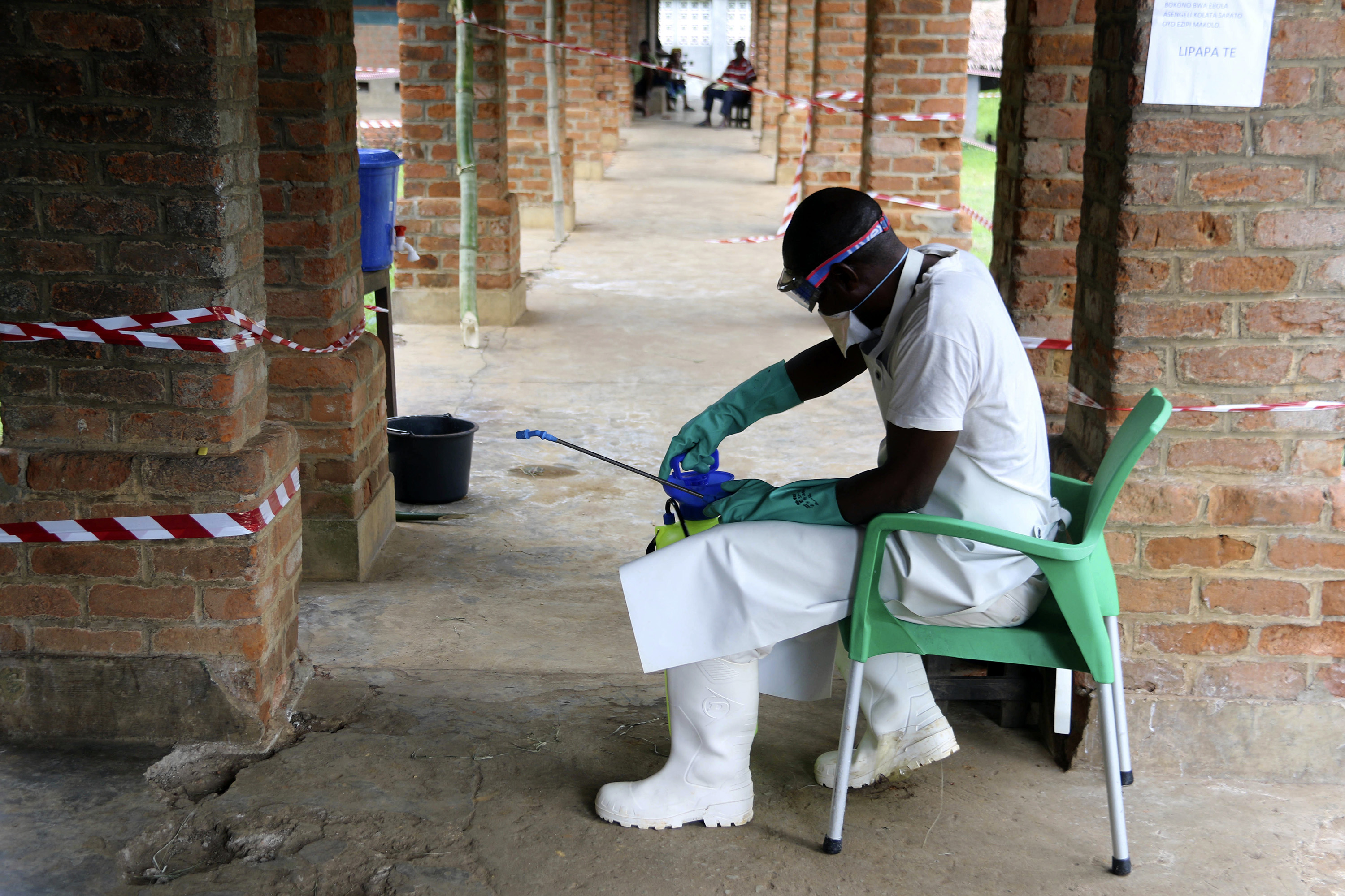 A health care worker wears virus protective gear at a treatment center in Bikoro, Democratic Republic of Congo, on May 13, 2018. (AP/John Bompengo)