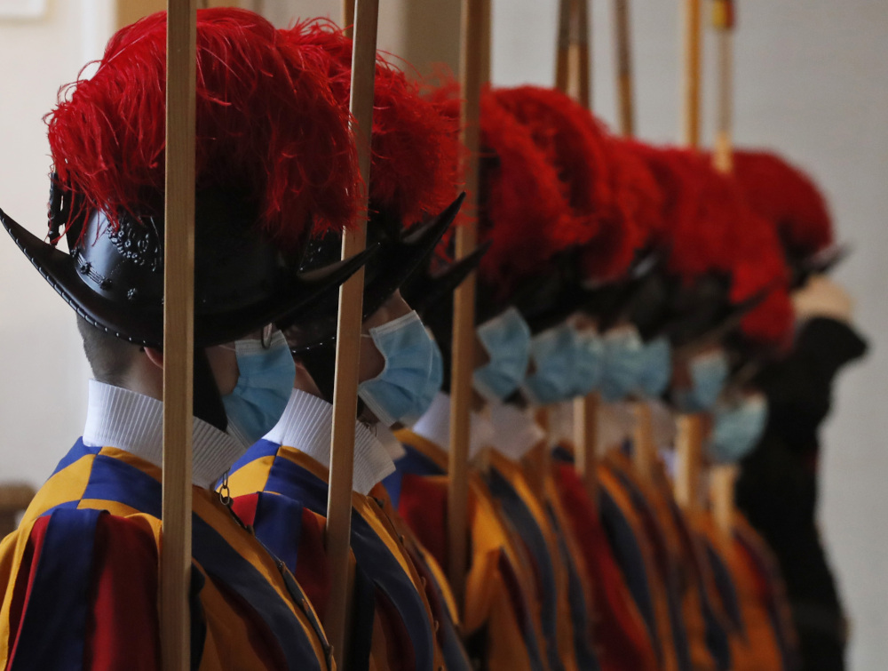The prime duty of the all-male corps, with its colorful uniforms and plumed helmets, is to protect the pontiff. The members stand guard during papal ceremonies as well as at the various entrances of the tiny, independent walled city state near Rome's Tiber River. During the pandemic, the guardsmen on duty don protective surgical masks.
