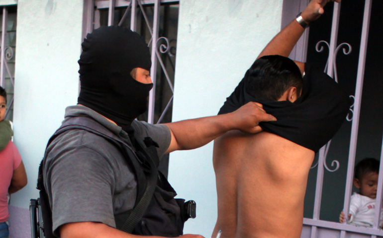 A member of the Honduran police arrests a man during anti-gang operations in 2012 in an area controlled by gang members in Tegucigalpa, Honduras. (CNS/Gustavo Amador, EPA)