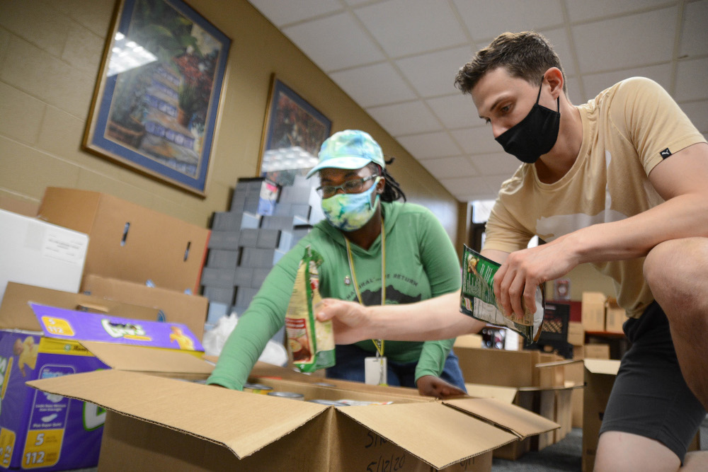 Andrea Dowlen, left, an Americorps worker with Catholic Charities of Tennessee, and Matthew Grimes, a Catholic Charities volunteer, fill emergency food boxes July 7, 2020, for people who have been affected by the COVID-19 pandemic and the March 3 tornadoes. The boxes contain enough food to feed two people for five to seven meals. (CNS/Tennessee Register/Andy Telli)