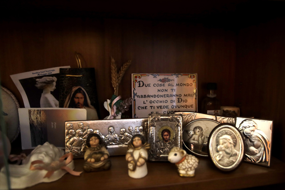 Religious miniatures are displayed in a showcase at Yolanda Martínez's home, during a Jan. 31 interview with the Associated Press, in Milan, Italy. (AP/Luca Bruno)