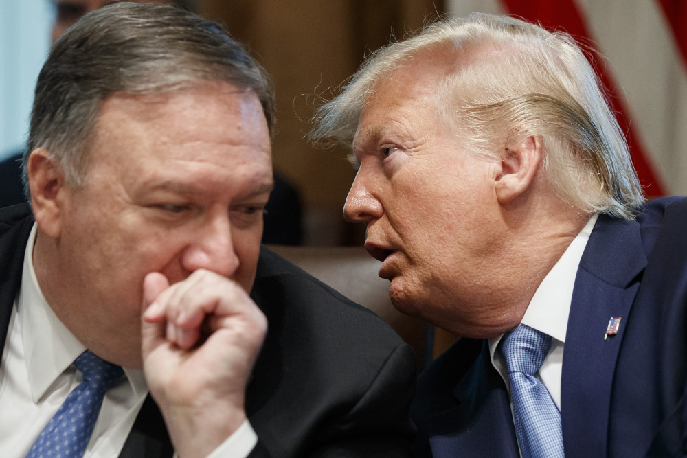 Secretary of State Mike Pompeo, left, and President Trump whisper during a Cabinet meeting in the Cabinet Room of the White House on July 16, 2019, in Washington. (AP/Alex Brandon)