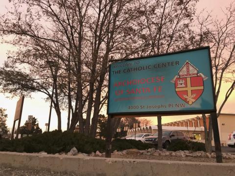 In this Nov. 29, 2018, file photo, the sun sets on a sign in front of the Archdiocese of Santa Fe offices in Albuquerque, N.M. A former Roman Catholic priest found guilty of sexual abuse in New Mexico is scheduled to be sentenced Friday, Sept. 13, 2019, in Santa Fe, N.M. Federal prosecutors are requesting a sentence of more than 30 years in prison for Arthur Perrault, once a pastor at an Albuquerque parish and a chaplain at Kirtland Air Force Base. Perrault maintained his innocence throughout his trial in April. (AP Photo/Susan Montoya Bryan/File)