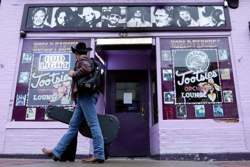A man walks by Tootsie's Orchid Lounge, closed because of the coronavirus, Monday, March 16, 2020, in Nashville, Tenn. Nashville Mayor John Cooper has called for bars on Broadway and throughout the county to close until further notice. He also asked restaurants to limit seating to 50 percent of capacity, with a cap of 100 people, and restaurant bars to not allow standing. (AP Photo/Mark Humphrey)