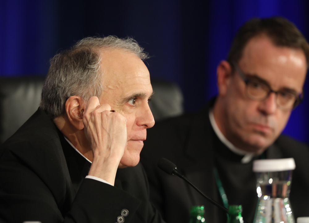 Cardinal Daniel DiNardo of Galveston-Houston, president of the U.S. Conference of Catholic Bishops, looks on at the conclusion of the second day of the spring general assembly of the USCCB in Baltimore June 12, 2019. Looking on is Msgr. J. Brian Bransfield, general secretary. (CNS/Bob Roller)