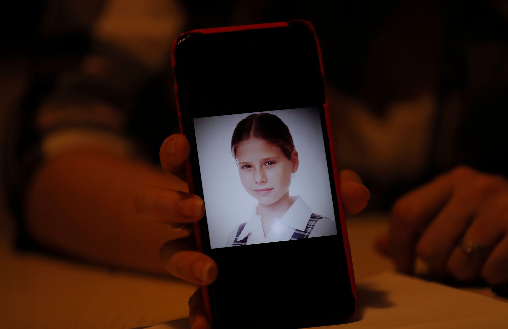 In this Jan. 14, 2020 photo, Ana Lucia Salazar shows a photo of herself when she was 8-years-old, on her smart phone during an interview with the Associated Press in Mexico City. At the time Salazar says she was sexually abused by a Legion of Christ priest. (AP/Marco Ugarte)