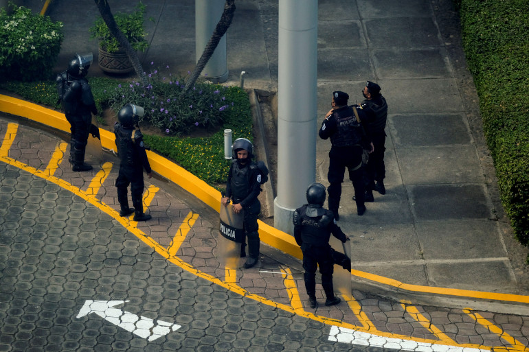 Nicaraguan security forces keep watch outside the Invercasa building as they raid the office of the independent news outlet Confidencial in Managua, Nicaragua, May 20, 2021. (CNS photo/Carlos Herrera, Reuters)