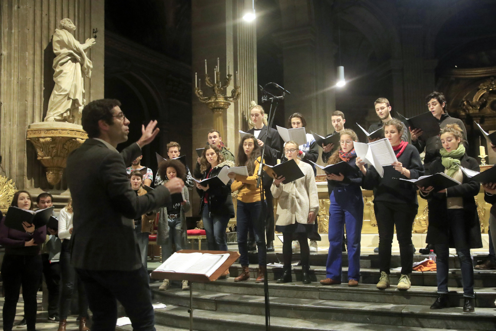 In this photo taken Dec. 16, Notre Dame cathedral choir's director Henri Chalet directs the Notre Dame choir during a rehearsal at the Saint Sulpice church in Paris. (AP/Michel Euler)