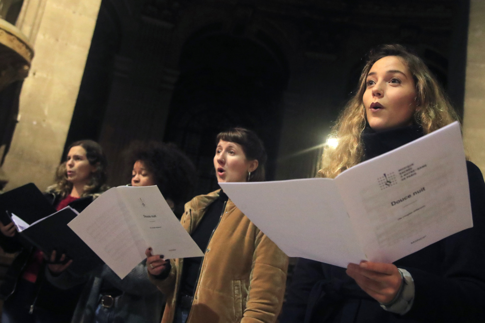 In this photo taken Dec. 16, members of the Notre Dame cathedral choir sing during a rehearsal at the Saint Sulpice church in Paris. (AP/Michel Euler)
