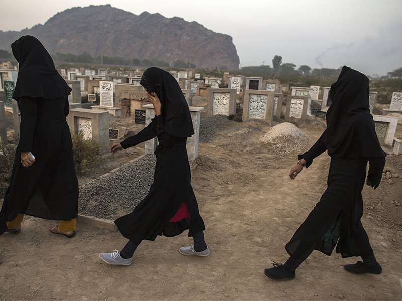Ahmadi women walk past graves at the Ahmadi graveyard in the town of Rabwah, Pakistan, on Dec. 9, 2013. Three years earlier, 86 Ahmadis were killed in two simultaneous attacks on Friday prayers in Lahore. (Zohra Bensemra/Reuters)