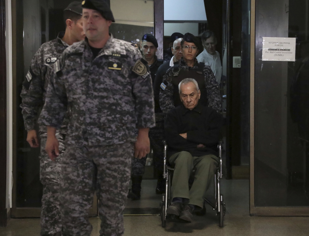 Fr. Nicola Corradi, in wheelchair, Armando Gomez and Fr. Horacio Corbacho, back right, are escorted into a courtroom, accused of alleged sexual abuse of deaf children at a Catholic-run school, in Mendoza, Argentina, Monday, Nov. 25, 2019. The three men are accused of 25 acts of aggravated sexual abuse, abuse and corruption of minors, between 2004 and 2016. The victims are 10 former students. Judges are scheduled to rule Monday in the case. (AP/Marcelo Ruiz Mendoza)