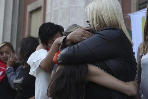The mothers of the alleged sex abuse victims from the Antonio Provolo Institute for Deaf and Hearing Impaired Children, stand and embrace in front of the court building in Mendoza, Argentina, Monday, Nov. 25, 2019. Three men stand accused of 25 acts of aggravated sexual abuse, abuse and corruption of the minors, between 2004 and 2016. The victims are 10 former students of the school. Judges are scheduled to rule in the case today. (AP/Marcelo Ruiz Mendoza)