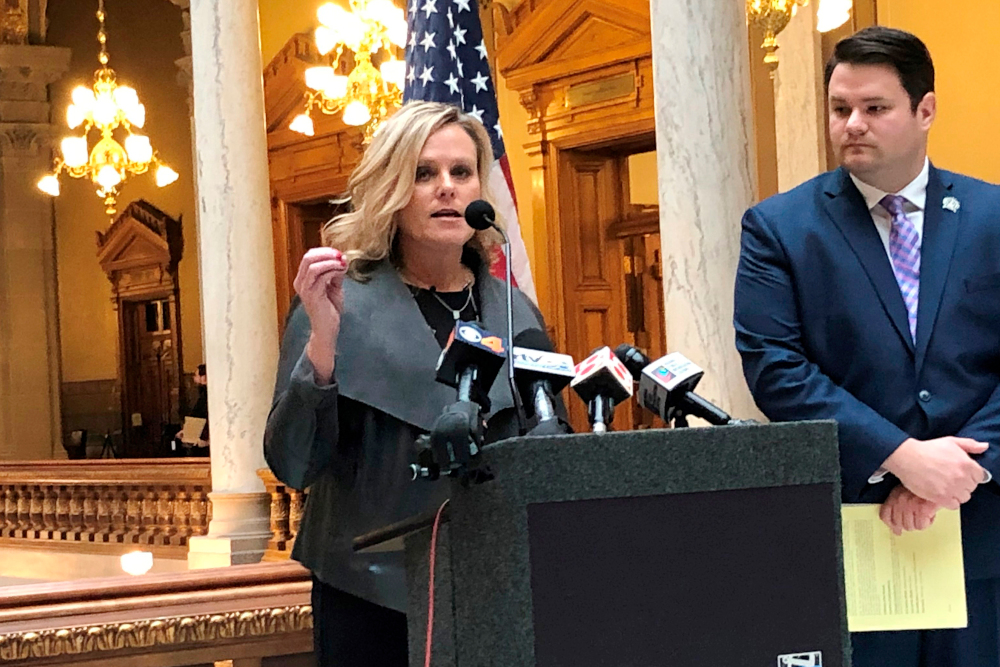 Republican Indiana Superintendent of Public Instruction Jennifer McCormick speaks during a news conference with state Sen. J.D. Ford, D-Indianapolis, on Friday, Jan. 3, 2020, at the Statehouse in Indianapolis, in support of a bill that would ban private schools that discriminate against gay employees and students from receiving money from Indiana's voucher program. (AP/Tom Davies)
