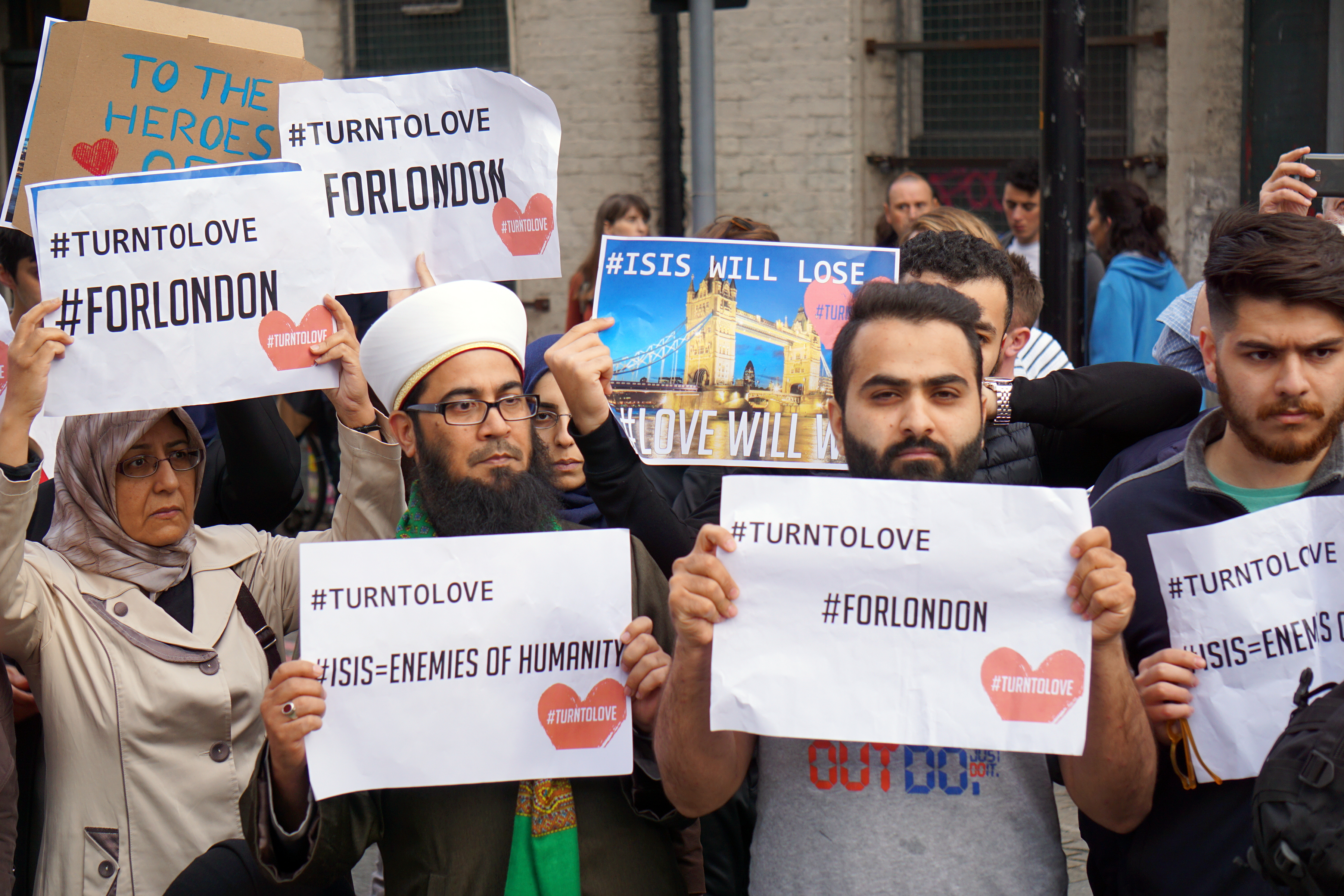 Muslims hold signs saying "ISIS WILL LOSE" and "#TURNTOLOVE" on June 4, 2017, at the police cordon surrounding the site in south London of the deadly van-and-knife attack that killed several people. Many Muslims came out to condemn the attack. (AP/Raphael Satter)
