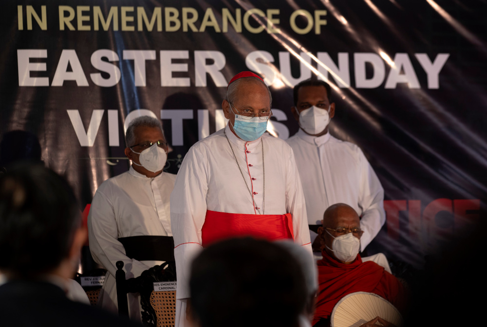 Cardinal Malcolm Ranjith, archbishop of Colombo, center, observes a two minute silence for the victims of the Easter Sunday attacks in 2019 during a service at St. Anthony's Church in Colombo, Sri Lanka, Wednesday, April 21, 2021. Wednesday marked the second anniversary of the serial blasts that killed 269 people. (AP Photo/Eranga Jayawardena)