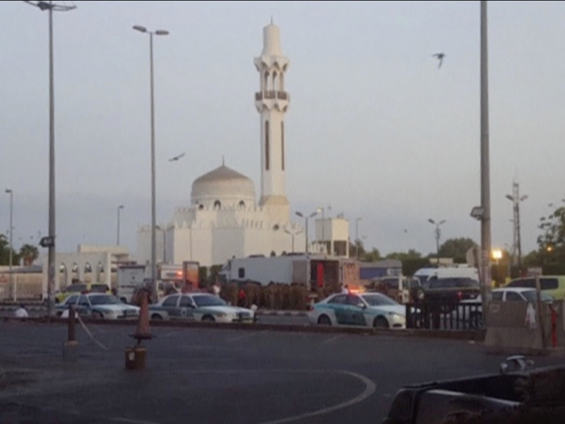 General view of security personnel in front of a mosque as police stage a second controlled explosion, after a suicide bomber was killed and two other people wounded in a blast near the U.S. Consulate in Jeddah, Saudi Arabia, in this still frame taken from video July 4, 2016. (Reuters)