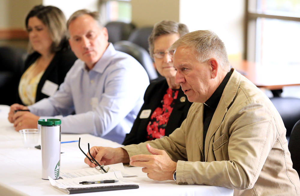 In this Sept. 30, 2019 photo St. Ambrose University professor Fr. Bud Grant speaks during a Climate Change discussion with Bishop Thomas Zinkula at the Rogalski Center on the campus of St. Ambrose University. Grant, a well-known professor and priest at a Roman Catholic college in Iowa has been suspended while the church investigates a sexual misconduct allegation dating to the 1990s, the school said Wednesday, March 18, 2020. (AP?Quad City Times/Kevin E. Schmidt)