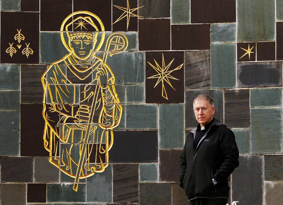 In this March 30, 2018 photo the Rev. Robert "Bud" Grant appears on the campus of St. Ambrose University in Davenport, Iowa. Grant, a well-known professor and priest at a Roman Catholic college in Iowa has been suspended while the church investigates a sexual misconduct allegation dating to the 1990s, the school said Wednesday, March 18, 2020. (AP/Quad City Times/Kevin E. Schmidt)