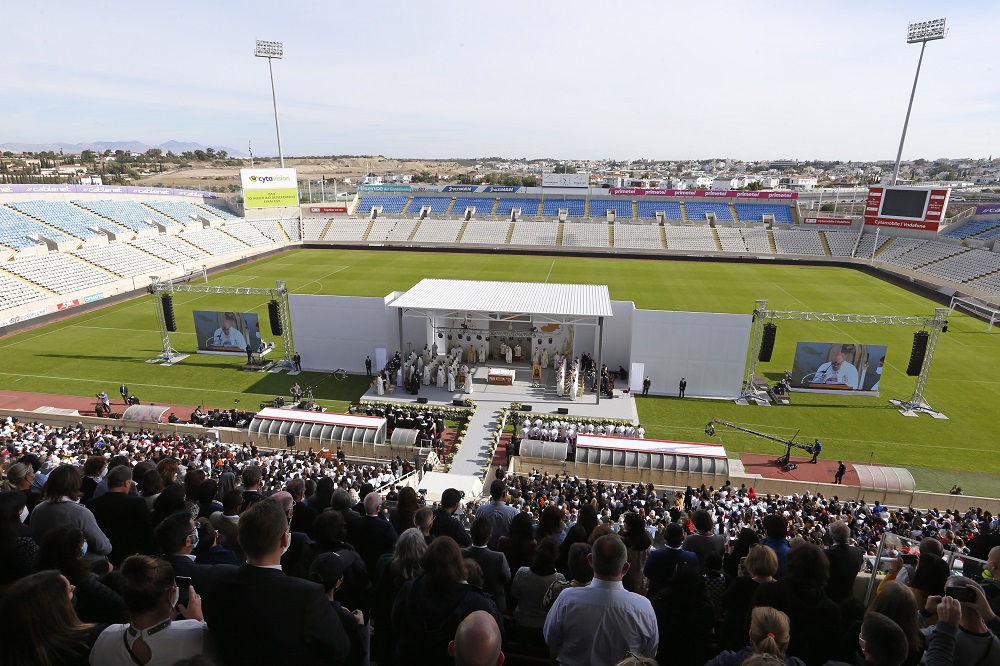 Pope Francis celebrates Mass at the GSP Stadium in Nicosia, Cyprus, Dec. 3, 2021. (Paul Haring/CNS)