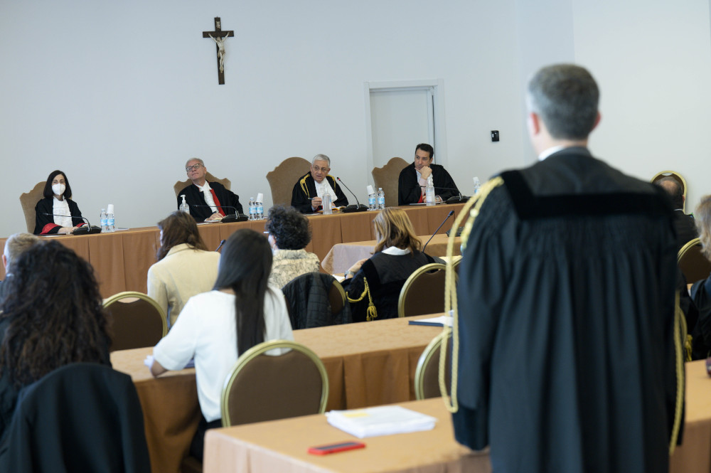Vatican judges are pictured during the 17th session of the trial of defendants accused of financial crimes at the Vatican in this May 20, 2022, file photo. Pictured from left are judges Lucia Bozzi, Venerando Marano, Giuseppe Pignatone and Carlo Bonzano. (CNS photo/Vatican Media)