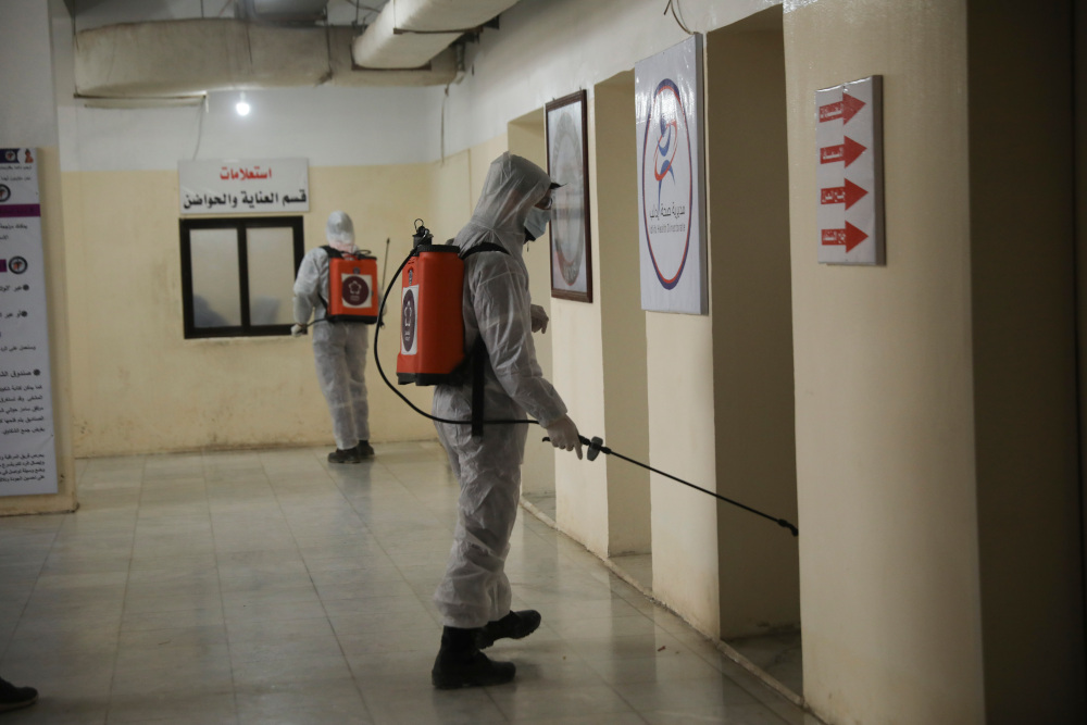 Members of a humanitarian aid agency disinfect Ibn Sina hospital as prevention against coronavirus in the city of Idlib, Syria, March 19, 2020. (AP/Ghaith Alsayed)