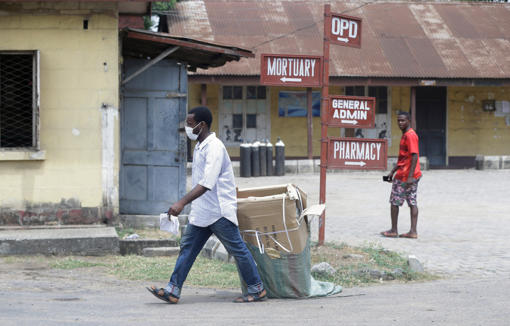 A man wearing face mask walks at the Yaba Mainland hospital where an Italian citizen who entered Nigeria on Feb. 25 from Milan on a business trip, the first case of the COVID-19 virus is being treated in Lagos Nigeria Friday, Feb. 28, 2020. Nigeria's health authorities have reported the country's first case of a new coronavirus in Lagos, the first confirmed appearance of the disease in sub-Saharan Africa. (AP/Sunday Alamba)