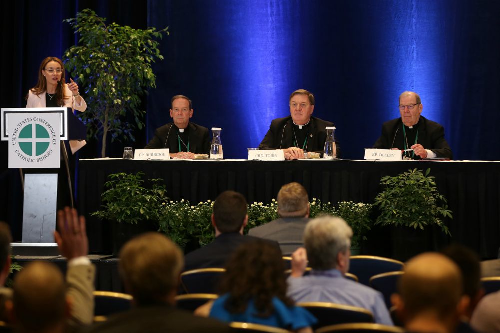 Judy Keane, director of the U.S. Conference of Catholic Bishops' Office of Public Affairs, calls on a reporter during a news conference June 13 at the spring general assembly of the U.S. Conference of Catholic Bishops in Baltimore. Pictured on the press panel are Bishop Michael Burbidge, Cardinal Joseph Tobin and Bishop Robert Deeley. (CNS/Bob Roller)