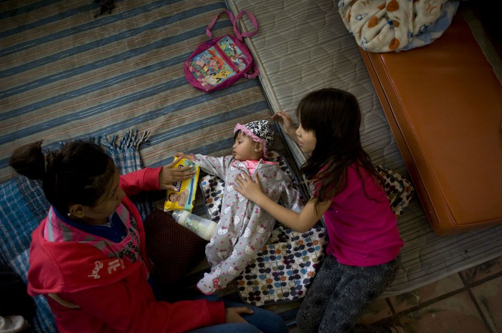An infant is cared for by her mother at a Catholic migrant shelter supported by Caritas in Tijuana, Mexico, April 24. They are from the Mexican state of Michoacan and fled north with others to the border with the U.S. to seek asylum because of increased violence in southern Mexico. (CNS/David Maung)