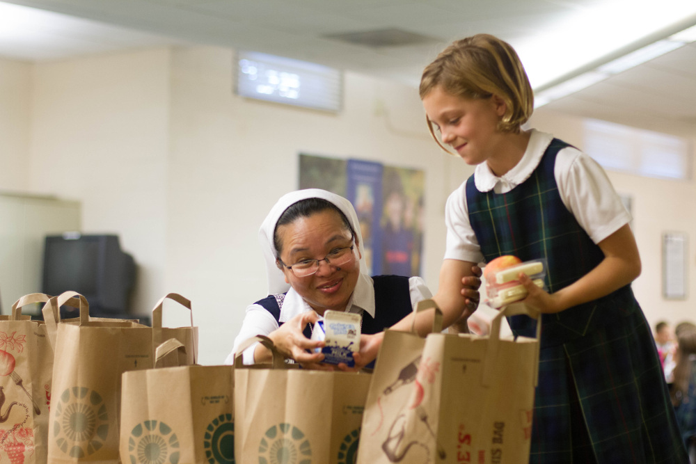 La Sallette Sr. Aniliza Juan, volunteer coordinator at Christ House in Alexandria, Virginia, and Lucy Allen, a student at the Basilica School of St. Mary in Alexandria, put food donated from students of the Catholic school into bags Oct. 24, 2017. (CNS/Catholic Herald/Ashleigh Kassock)