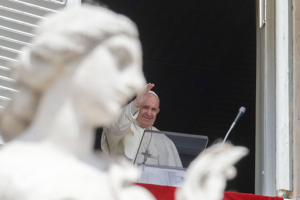 Pope Francis delivers his blessing as he recites the Regina Caeli noon prayer from the window of his studio overlooking St. Peter's Square, at the Vatican, Sunday, April 18, 2021. Pope Francis said he is happy to be back greeting the faithful in St. Peter’s Square faithful for his traditional Sunday noon blessing after weeks of lockdown measures. (AP/Andrew Medichini)