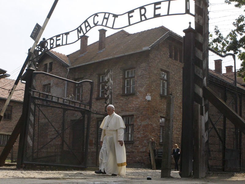 Pope Francis walks through a gate with the words "Arbeit macht frei" (Work sets you free) at the former Nazi German concentration and extermination camp Auschwitz-Birkenau in Oswiecim, Poland, on July 29, 2016. (Photo by Kacper Pempel/Reuters)