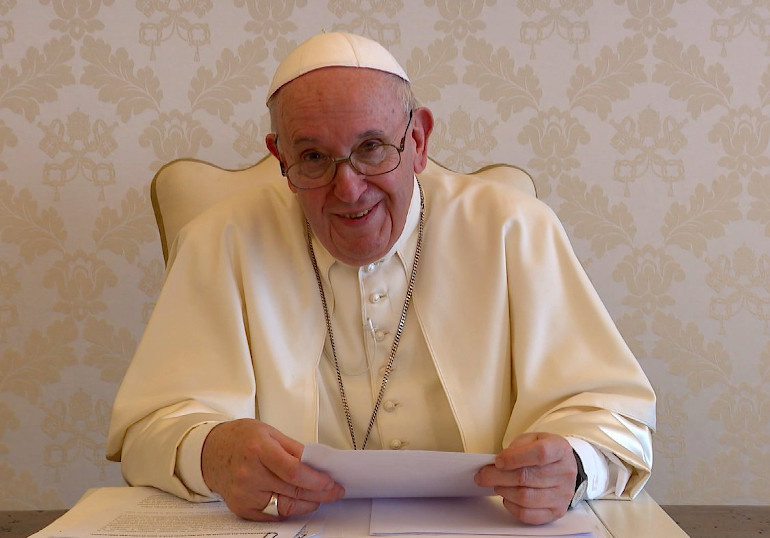 Pope Francis speaks in a video message to participants of the Argentine Association of Christian Business Executives' annual meeting in this still from a video released by the Vatican June 30, 2021. (CNS photo/Vatican Media)