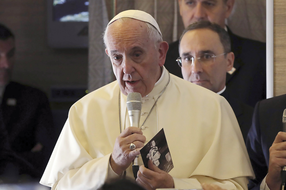 In this Jan. 15, 2018, file photo, Pope Francis holds a photo of U.S. photographer Joseph Roger O'Donnell of child victims of Nagasaki bombing, aboard his flight to Santiago, Chile. The Vatican said Friday, Sept. 13, 2019, Pope Francis will visit Thailand and Japan on Nov. 19-26. (AP Photo/Alessandra Tarantino, File)