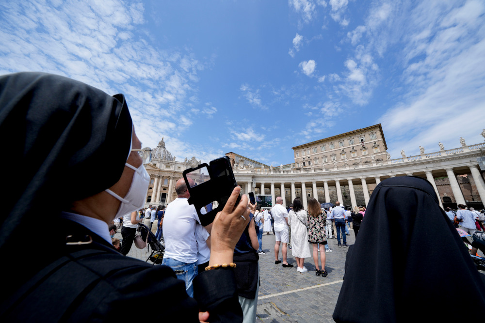 A nun takes pictures as Pope Francis recites the Angelus noon prayer from the window of his studio overlooking St. Peter's Square, at the Vatican, Sunday, May 30, 2021. (AP Photo/Andrew Medichini)